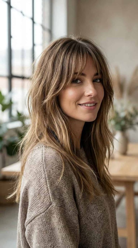 Long wolf hair with curtain bangs blends length with soft, center-parted fringe. The bangs frame the face while the layers keep the length from feeling heavy.
